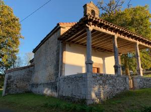La parroquia de San Pedro de Allence es de poca consideración entre las del concejo de Pravia; pero es preciso hablar primero de ella según el rumbo que seguimos. Digo que es de poca consideración, no por otro motivo que el de su corto vecindario; pues por lo que toca a antigüedad podría ser de las primeras. Llámase de Allence, esto es, de allende, por estar situada al otro lado del río, respecto a San Martín, que pretende mayoría. (…) Compónese Allence del lugar principal de este nombre, donde está la iglesia o iglesias, y del de Quintana al otro lado del río, en la parte de San Martín; y todo su vecindario apenas pasa de cuarenta vecinos. (…) La que hace de iglesia parroquial de San Pedro de Allence es la más chica y más mala de dos que allí hay a un tiro de escopeta una de otra, y que está más al sur. Aun la casa del cura está junto a la que no es parroquial; y allí también se junta la gente para las romerías; que ciertamente es una lástima que no pase a esta el servicio parroquial, cuando a poco costo se podía poner decentísima; y la primera de que hablamos, sólo haciéndola “a fundamentis” se conseguiría; con que basta para que se entienda nada hay que notar en esta iglesia parroquial, que sea digno de historiarse, pues aun su antigüedad por el género de su fábrica, no me pareció grande ni comparable con la de que vamos a tratar inmediatamente. (…) Nota: que en la iglesia parroquial la puerta de travesía tiene un escudo arriba con dos llaves y cordón de San Francisco.