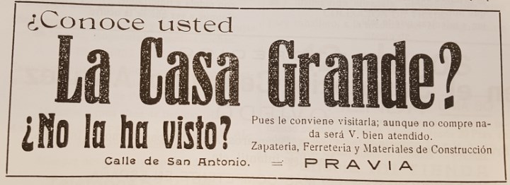Por el expediente de ensanche de la calle San Antonio (Archivo Histórico Municipal de Pravia, 394/3) sabemos que se autoriza, en la sesión plenaria de 31 de diciembre de 1928, a José Martínez Bances, «El Cuco», a construir un edificio en su finca de ««Huerta del Palomar» dando frente a la calle de San Antonio de esta villa.» La especialista en arquitectura indiana Covadonga Álvarez Quintana escribe, en Indianos y arquitectura en Asturias 1870-1930 (tomo I, p. 233), que el edificio en el que se instaló «La Casa Grande» es «uno de los escasos ejemplos de esta arquitectura nacional-regionalista proyectada para inmuebles de pisos y no para viviendas unifamiliares. La casa de «El Cuco», a pesar de su evidente conexión con el estilo montañés, sirve de introducción a ese otro capítulo observado igualmente dentro de la producción indiana y que nos informa de la existencia de una arquitectura vinculada a un concepto genérico de nacionalismo, bien por integrar vocablos de inspiración barroca, bien por asumir códigos protorrenacentistas, renacentistas popularizados a través del montañés, bien por reproducir soluciones ambiguas pero de indiscutible nexo con nuestros estilos históricos.» El edificio albergó «La Casa Grande», que en 1931 se anunciaba así: