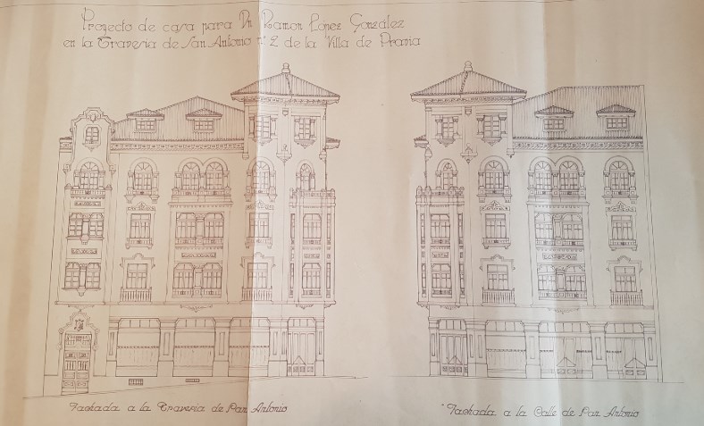 En julio de 1941, el indiano Ramón López Fernández pidió los permisos pertinentes para la construcción, en la calle de San Antonio, de un edificio cuyo proyecto y planos corrieron a cargo del arquitecto municipal, el incansable Leopoldo Corugedo. Este singular edificio, propio del historicismo nacional de posguerra, según la ya mencionada Covadonga Álvarez Quintana, es una edificación «de adaptación y libre interpretación» del estilo montañés, en este caso «casas de pisos insertas en la trama urbana». (Indianos y arquitectura en Asturias 1870-1930, tomo I, p. 228).