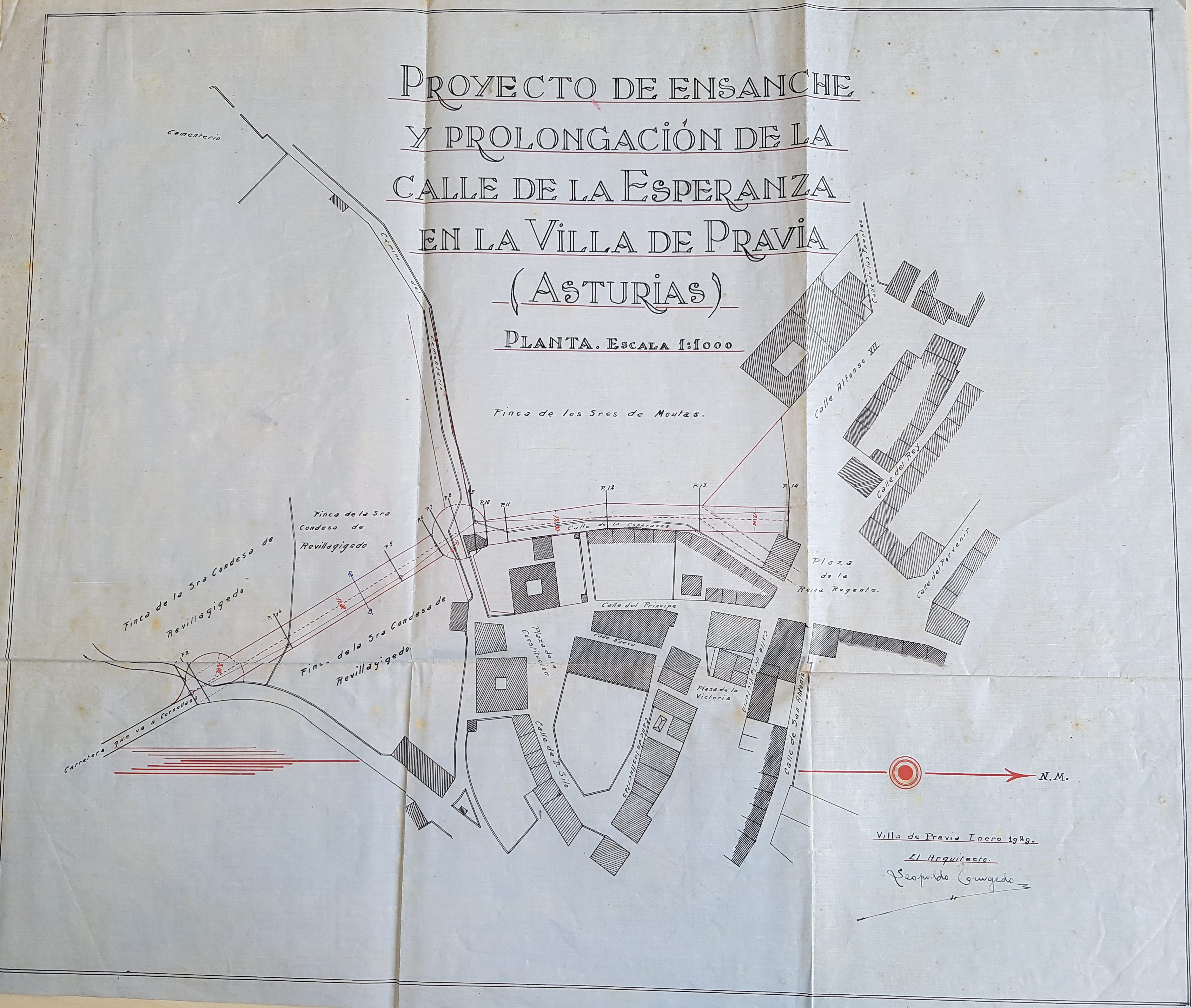 El trazado de la nueva calle será el siguiente: arrancará de la Plaza de la Reina Regente, hoy Conde de Guadalhorce, punta A del plano desde la misma esquina de la casa de Florentino García Marqués y por la finca de los señores Moutas con parte por la de los hijos de don Carlos Arias con un ancho de quince metros (…). Entrará después en la finca de la señora Condesa de Revillagigedo y seguirá en línea recta hasta su final, que será la unión de la carretera de Cornellana y próximo a punto llamado de Aloyas donde se hará una plaza semicircular de quince metros de radio.»