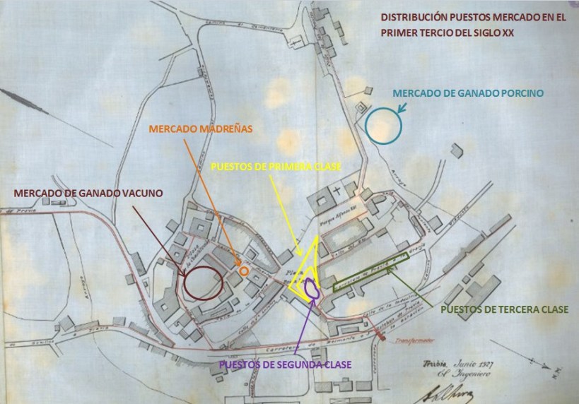 El nuevo sistema tributario no debió ser muy exitoso, ya que en 1910 volvió a modificarse, ahora sí de forma más permanente. Las diferencias entre la primera y la segunda clase pasaron a fijarse en función del lugar de ubicación y de los productos en venta; ya que ambas afectaban a puestos de textiles. Las dimensiones de cada uno de los puestos correspondientes a estas dos clases estaban determinadas por un paralelogramo rectangular, de dos metros de lado por cinco de fondo. La tercera clase comprendía a todos los demás puestos; las tiendas de esta modalidad se situaban en la plaza de la Reina Regente, independientemente de sus dimensiones. Los puestos dedicados a la venta de cereales, frutas, legumbres, de artículos de consumo y toda clase de alimentos, así como los procedentes de industrias domiciliadas dentro del concejo; es decir, los negocios de la villa que el jueves instalasen una tienda al aire, estaban exentos de las tarifas del mercado.