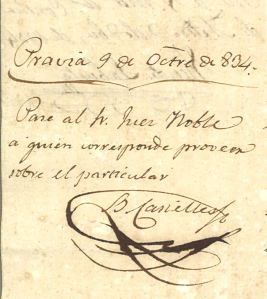 Don Pedro López de Grado y Omaña, alcalde presidente de Ayuntamiento de esta Villa de Pravia y su concejo, comandante de la Guardia Nacional a caballo del mismo: D. Bernardino de Busto Miranda, procurador del común y D. Miguel de Busto Miranda secretario de dicho ayuntamiento= certificamos: que don Benito Casielles Meana juez de primera instancia de la referida villa y su partido, se halla desempeñando este destino desde primero de septiembre de mil ochocientos treinta y cuatro, desde cuyo día se ha ahitado individuo de la milicia urbana hoy Guardia Nacional de este dicho concejo en el arma de caballería: por sus antecedentes políticos y literarios fue recibido en el pueblo con entusiasmo y júbilo: contribuyó poderosamente con su conducta y ejemplo a mejorar el espíritu público en favor de nuestra augusta Reyna y libertades patrias y al armamento y formalización de dicha Guardia Nacional: y en el ejercicio del grave destino que desempeña, ha dado y está dando repetidas pruebas de consumada inteligencia, ilustración y cordura, cuyos títulos le hacen acreedor al aprecio y benevolencia del Ayuntamiento y del público. Conste donde convenga, y lo firmamos en Pravia y abril seis de mil ochocientos treinta y seis = Pedro López Grado = Bernardino de Busto = Miguel Ramón del Busto secretario