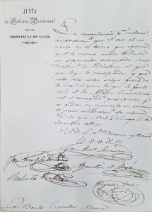 La conveniencia pública reclama imperiosamente que usted cese al momento en el destino que ejercía, y por lo mismo acordó la Junta su separación entregando inmediatamente la judicatura al que por ley le corresponda, y que antes de la noche salga fuera de la capital para lo que le facilitará el señor Alcalde Constitucional el correspondiente pasaporte; y de quedar en ejecutarlo se servirá usted avisar inmediatamente a la misma. Lugo, 14 de setiembre de 1840