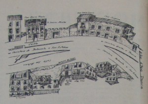 Don Jacinto Insunza, autor de este dibujo, me dice que él vio tales cimientos, muy anchos, y con su correspondiente y profundo foso. Y cuenta que el contratista, amigo suyo, se asustó bastante al topar con una cantidad tan grande de tierra movediza que llenaba el foso, pues no sabía a qué atribuir este hallazgo, y le creaba un problema de construcción que no esperaba encontrar.